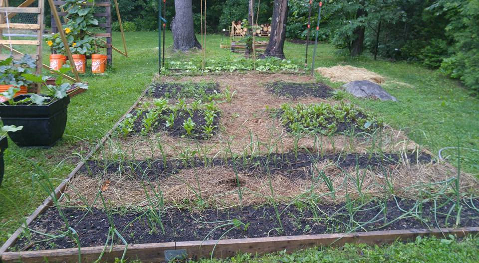 Ce type de potager vous permet de mettre au départ un bon terreau. Il est aussi légèrement surélevé ce qui le rend plus facile à entretenir. Toutefois, vu qu'il est surélevé, il s'assèche aussi plus vite si on n'y met pas de paillis. Si vous réalisez un grand jardin, je vous suggère fortement de cultiver en planche large (1 mètre x 1 mètre environ) et non en rangée (voir le dessin de mon jardin). Vous pourrez y mettre plus de légumes et la densité des plants va limiter la pousse de mauvaises herbes. Enfin cette densité permet aussi de limiter l'évaporation de l'eau grâce à l'ombrage du feuillage des plants.