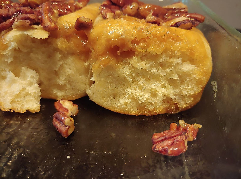 Pendant la cuisson des brioches, dans une casserole, chauffer le beurre, la cassonade et l'eau. À la sortie des brioches du four, répartir les pacanes sur le dessus des brioches de façon uniforme. Verser le caramel chaud sur les brioches pour bien les couvrir.